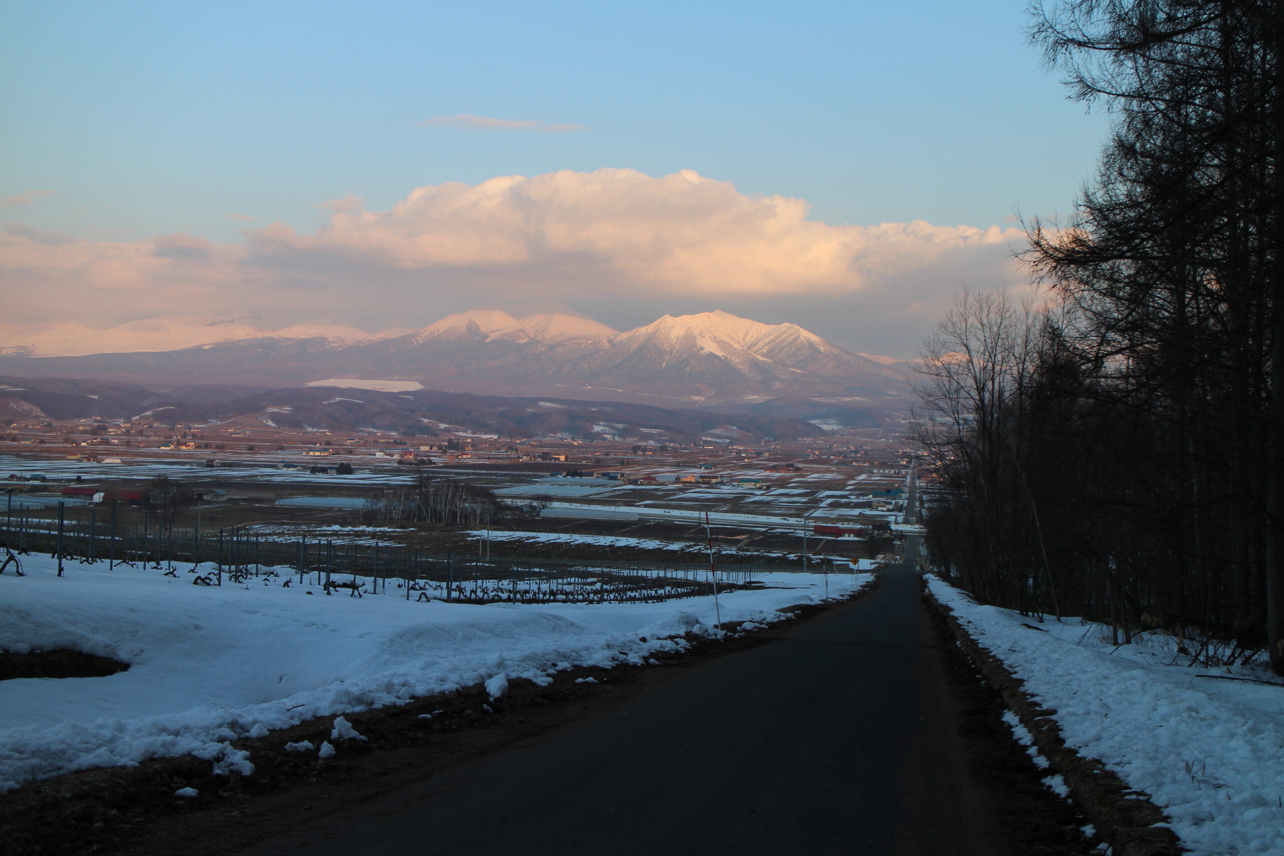 こんばんは(^^) 今日の夕方の風景です。朝は雪で白くて全然写真撮る気にならない …