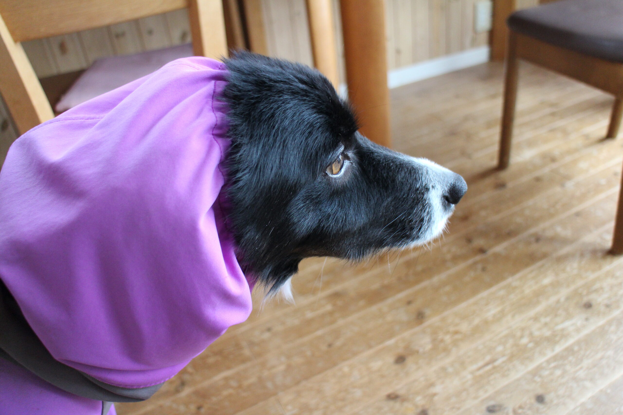 今日のクロエ。雨降ってなかったのにレインウェア着せられてた!