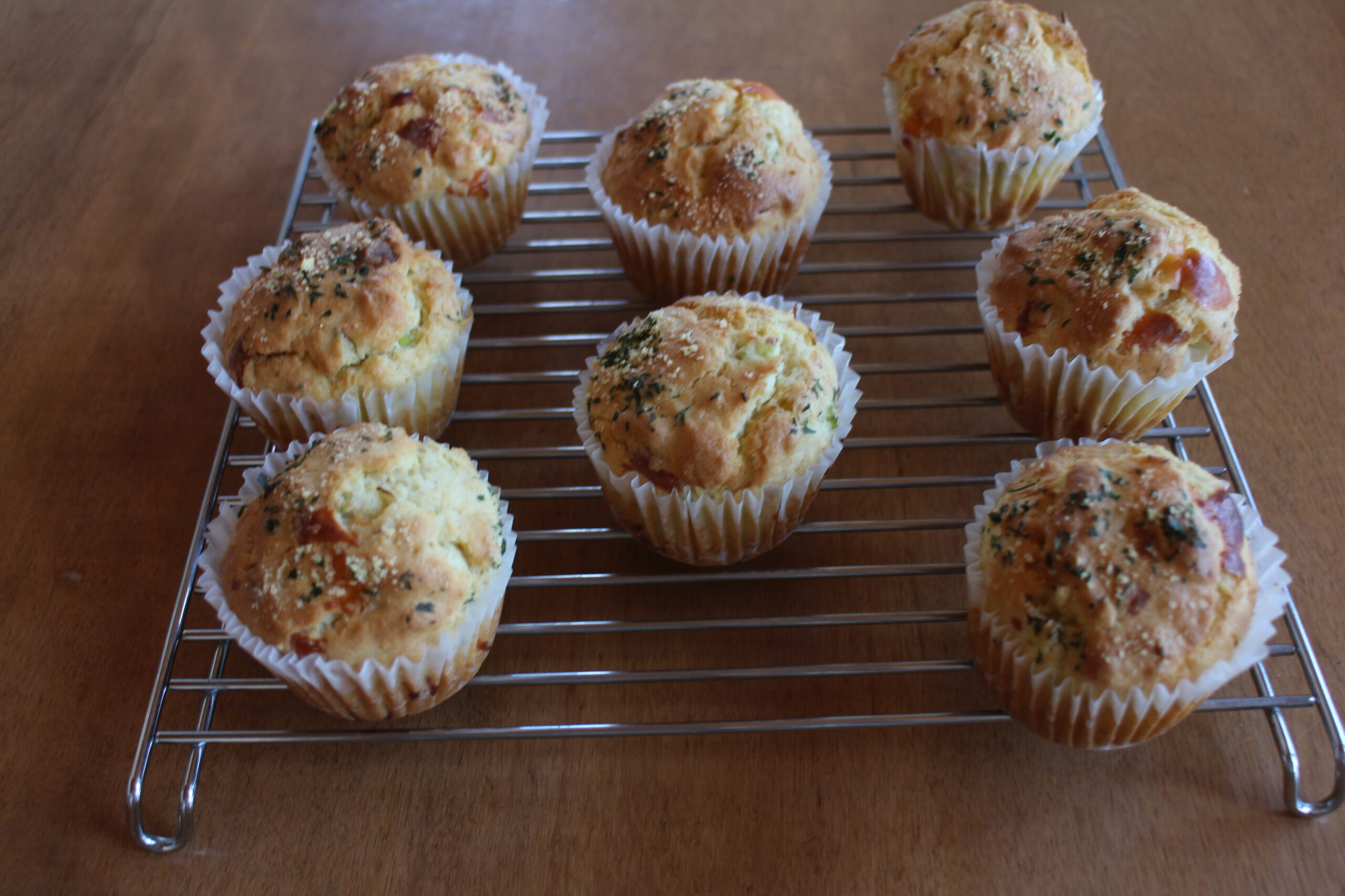 久しぶりにセイボリーマフィン、甘くないマフィンを焼きました。ネギとチーズのマフィンです。