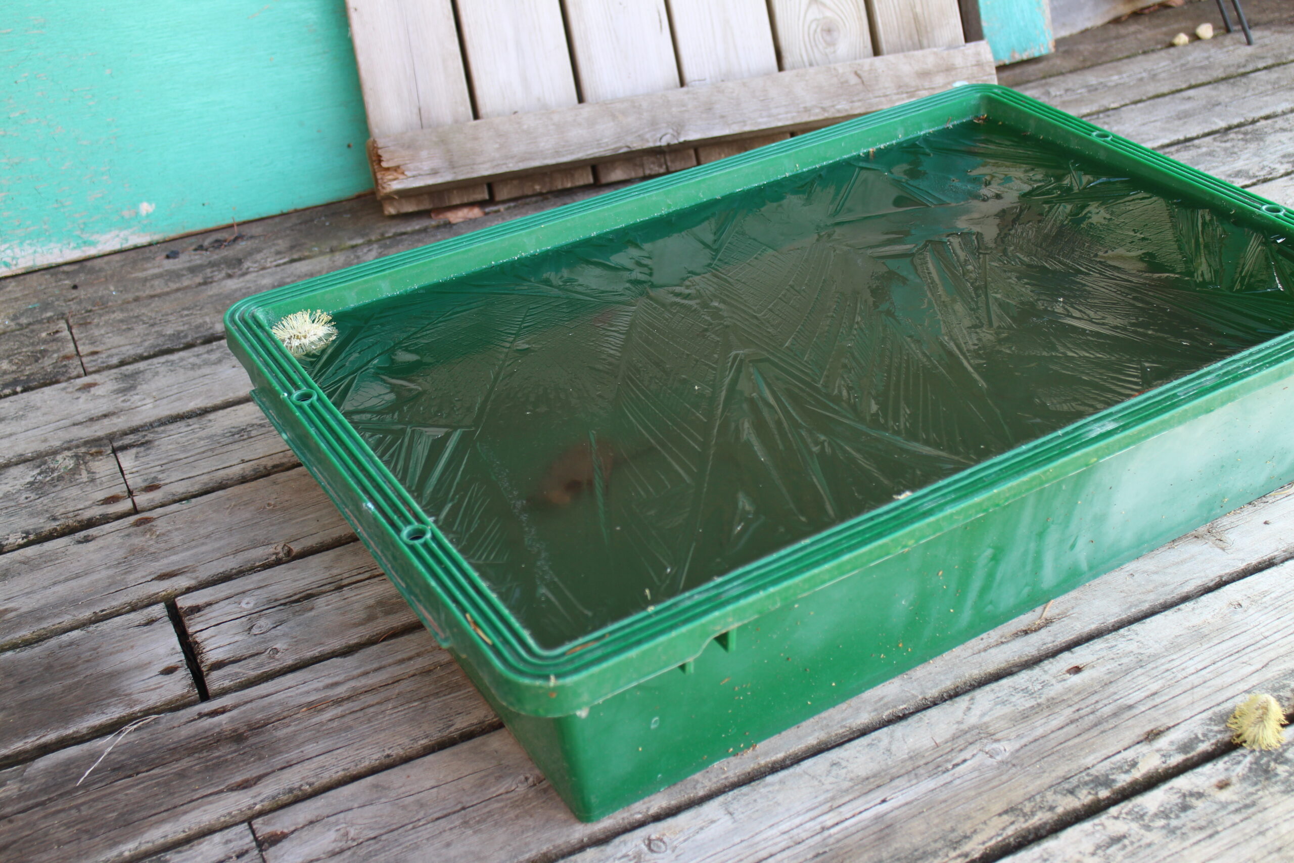溜めていた雨水が凍ってました。今朝の気温は-3℃だったそう。いやー寒かった。